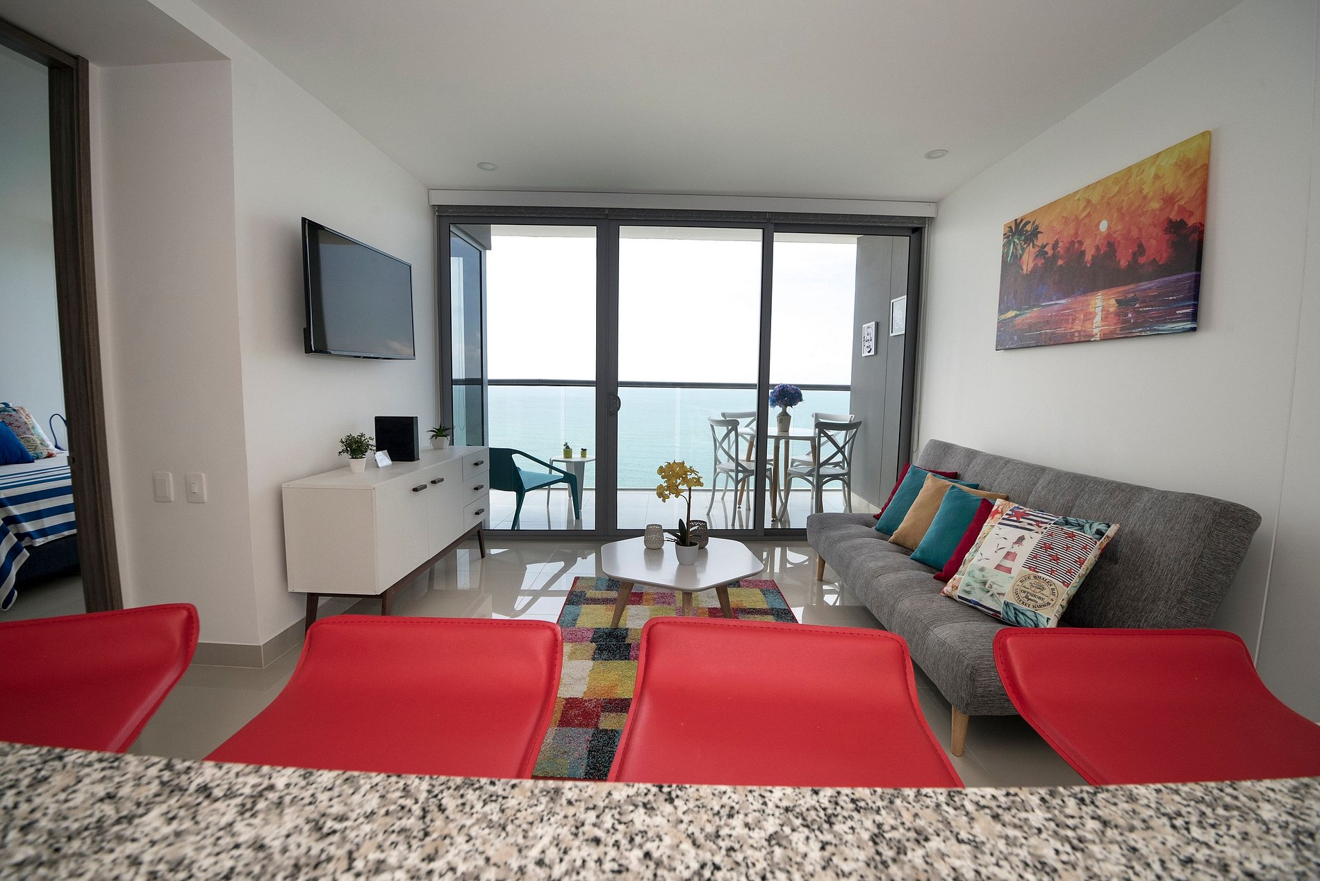 El apartamento está diseñado para ofrecer una experiencia cómoda y moderna, en perfecta armonía con el ambiente de Cartagena. Cuenta con cocina totalmente equipada, lavadora, secadora, toallas, ropa de cama y una decoración que combina elegancia y frescura para que su estancia sea realmente especial. Al registrarse, recibirá una pulsera que deberá usar durante toda su estancia; esto permite al edificio identificar fácilmente a los huéspedes. Con ella, tendrá acceso a las zonas comunes, como la piscina, el gimnasio ubicado en la planta S, así como al apartamento y al aparcamiento. Solo las personas registradas en la reserva pueden entrar al edificio. Para registrar a alguien nuevo, por favor, envíenme su nombre con 24 horas de antelación. El apartamento admite un máximo de 4 huéspedes registrados. La habitación principal ofrece un espacio cómodo y bien equipado, con: Dos camas dobles Baño privado Smart TV Aire acondicionado Armario privado Acceso directo al balcón La sala de estar es espaciosa y perfecta para relajarse o trabajar. Incluye: Sofá cama para dos Smart TV Aire acondicionado Baño completo (con ducha) Acceso al balcón El apartamento también cuenta con un balcón accesible tanto desde el dormitorio como desde la sala, perfecto para disfrutar de la brisa, tomar un café o simplemente relajarse al final del día. En resumen, es un espacio moderno, cómodo y perfectamente equipado para que disfrutes de Cartagena con total tranquilidad y estilo. ¡Te encantará tu estancia!