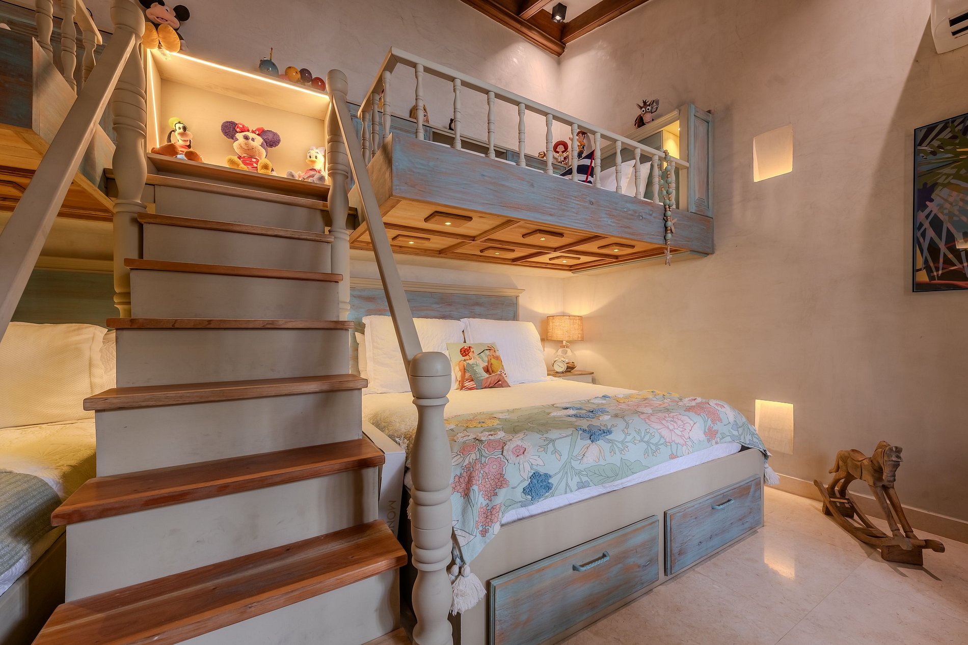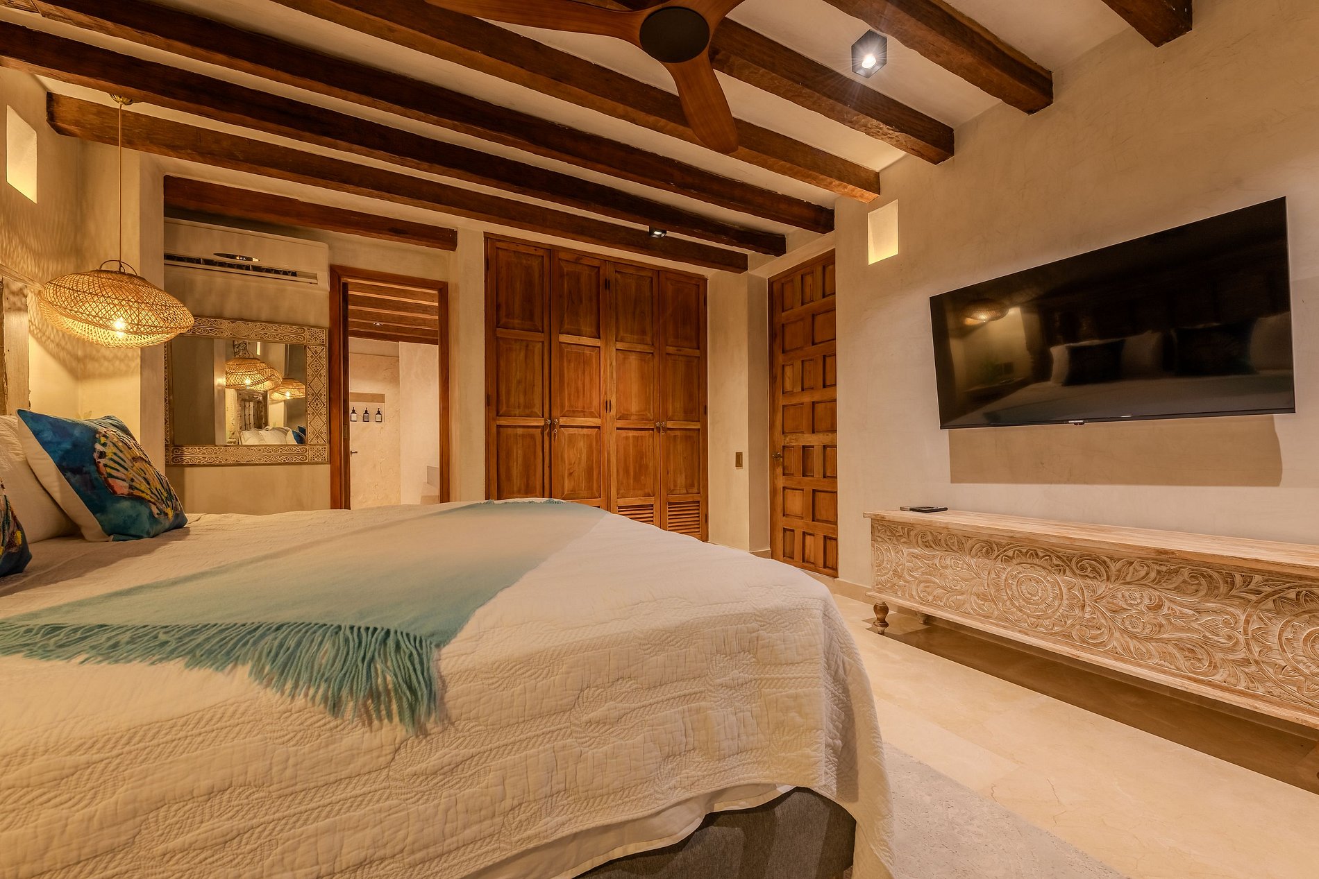 2 camas dobles + 2 camas sencillas · baño privado · TV satelital · A/C · 2 ventiladores · Wi-Fi · plancha · secador de pelo · amenidades · clósets