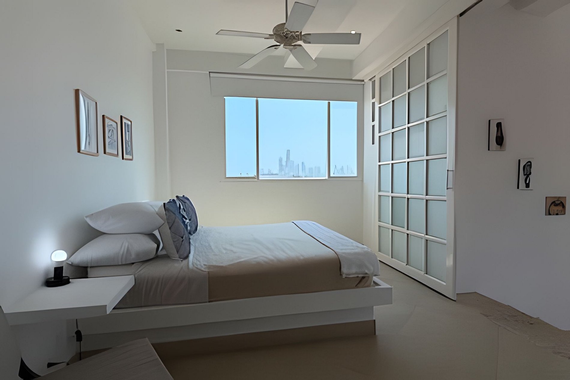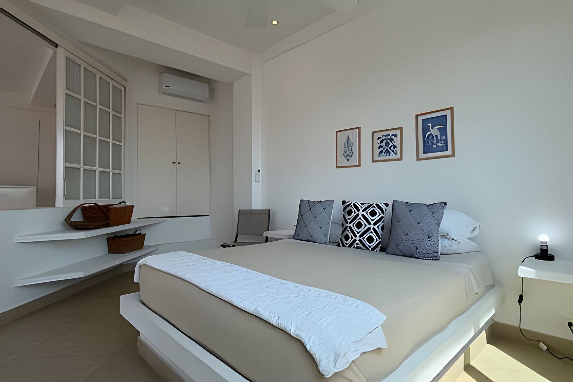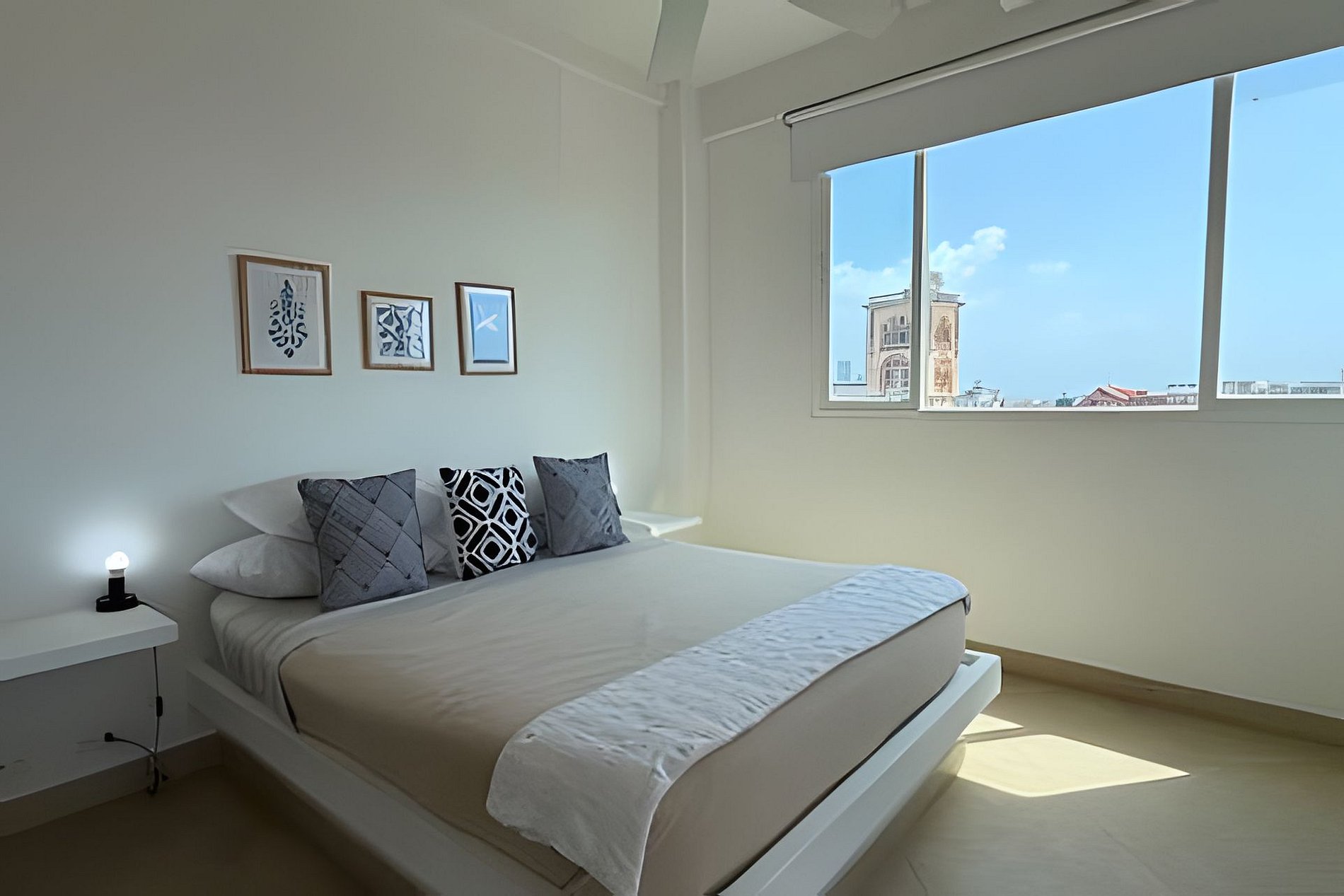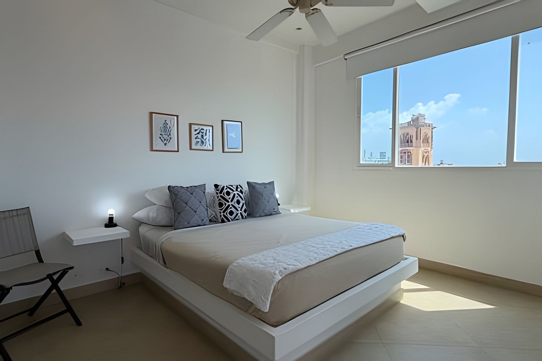 Bienvenido a tu refugio en el piso 5 del icónico Edificio Ganem: un apartamento de 1 habitación que te regala una de las vistas más impresionantes de Cartagena. Desde la sala, tendrás ante tus ojos el encanto colonial del Centro Histórico, el mar y la línea moderna de Bocagrande, todo en una sola postal que nunca olvidarás. Habitación: Cama Queen para un descanso reparador y baño privado. Clóset para tu ropa y maletas. Aire acondicionado Ventanas con una vista de película. Con una ubicación inmejorable, estarás a pasos del Centro Histórico y de la mejor oferta gastronómica, cultural y de compras de Cartagena. Este apartamento no tiene comparación: moderno, cómodo, y con un toque único que hará tu estadía inolvidable.