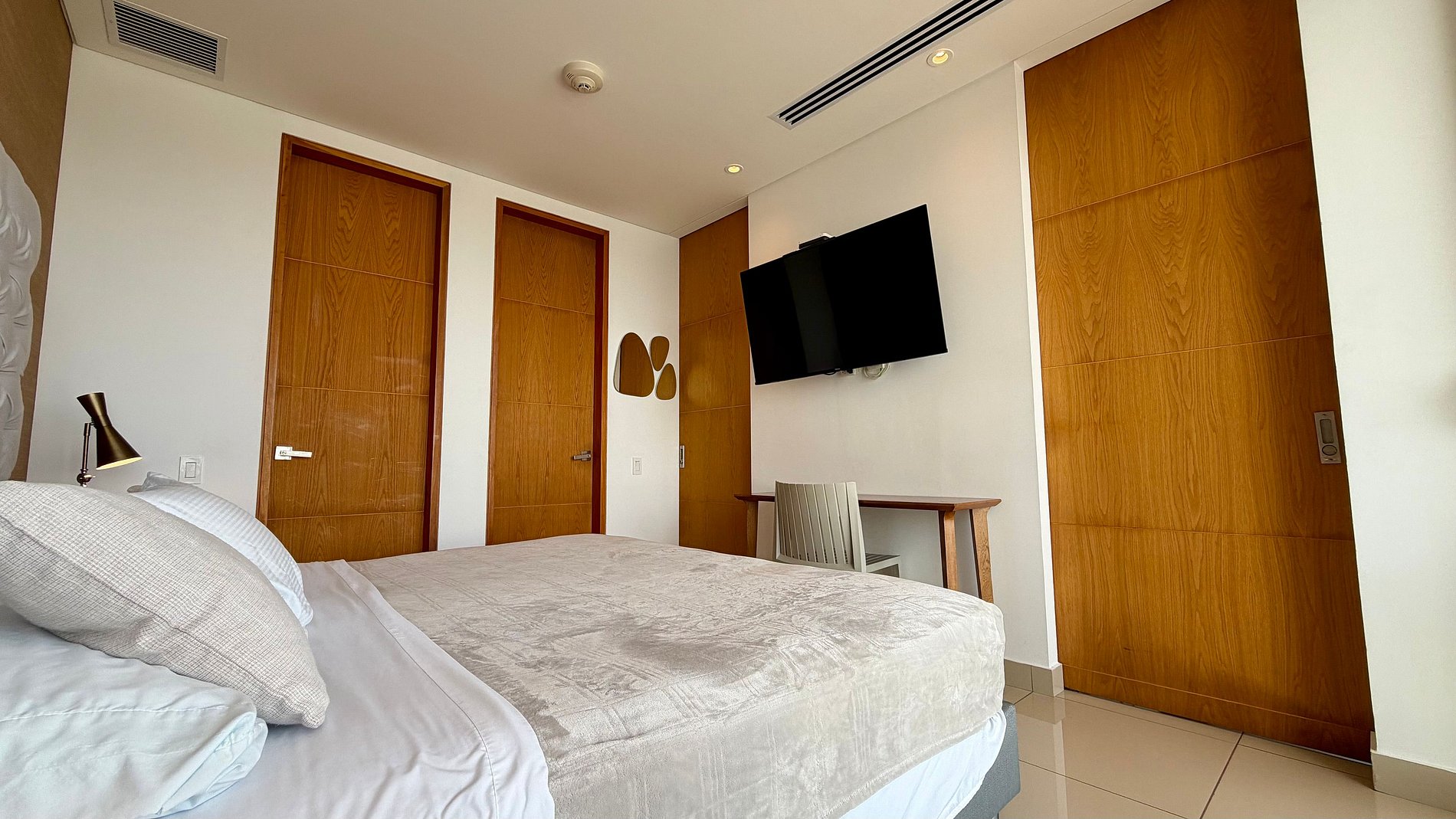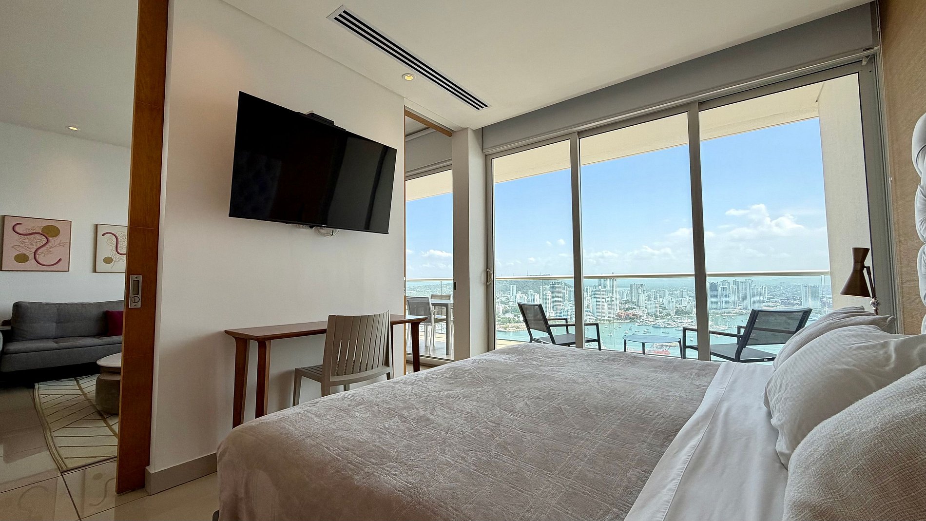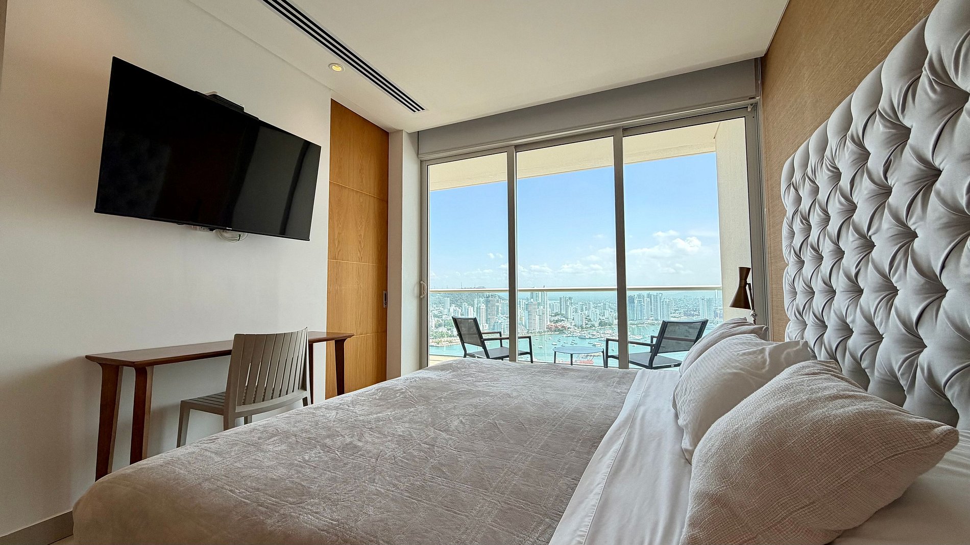 Habitación principal: Cama cómoda con ropa de cama premium Baño privado y amplio closet Smart TV y aire acondicionado central Acceso directo al balcón con vista a la bahía