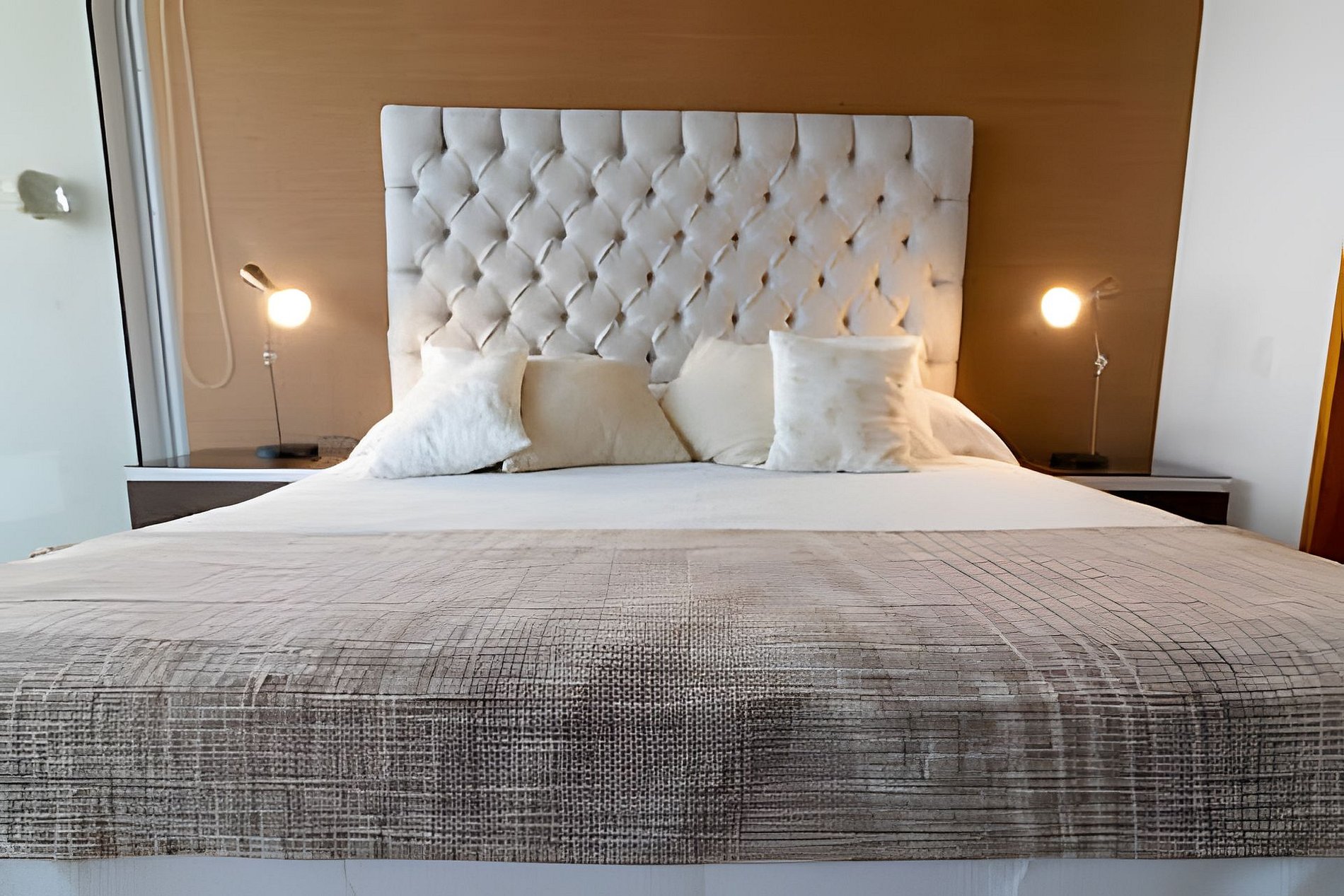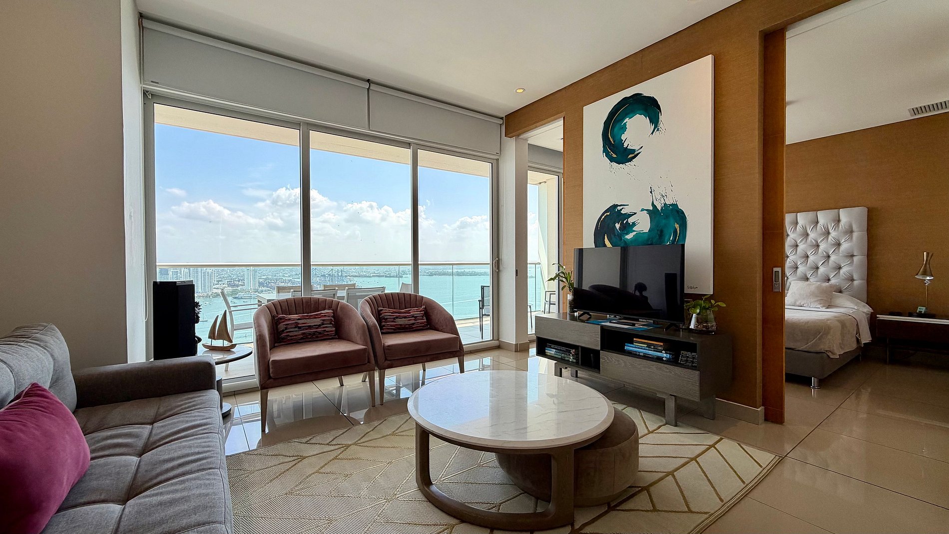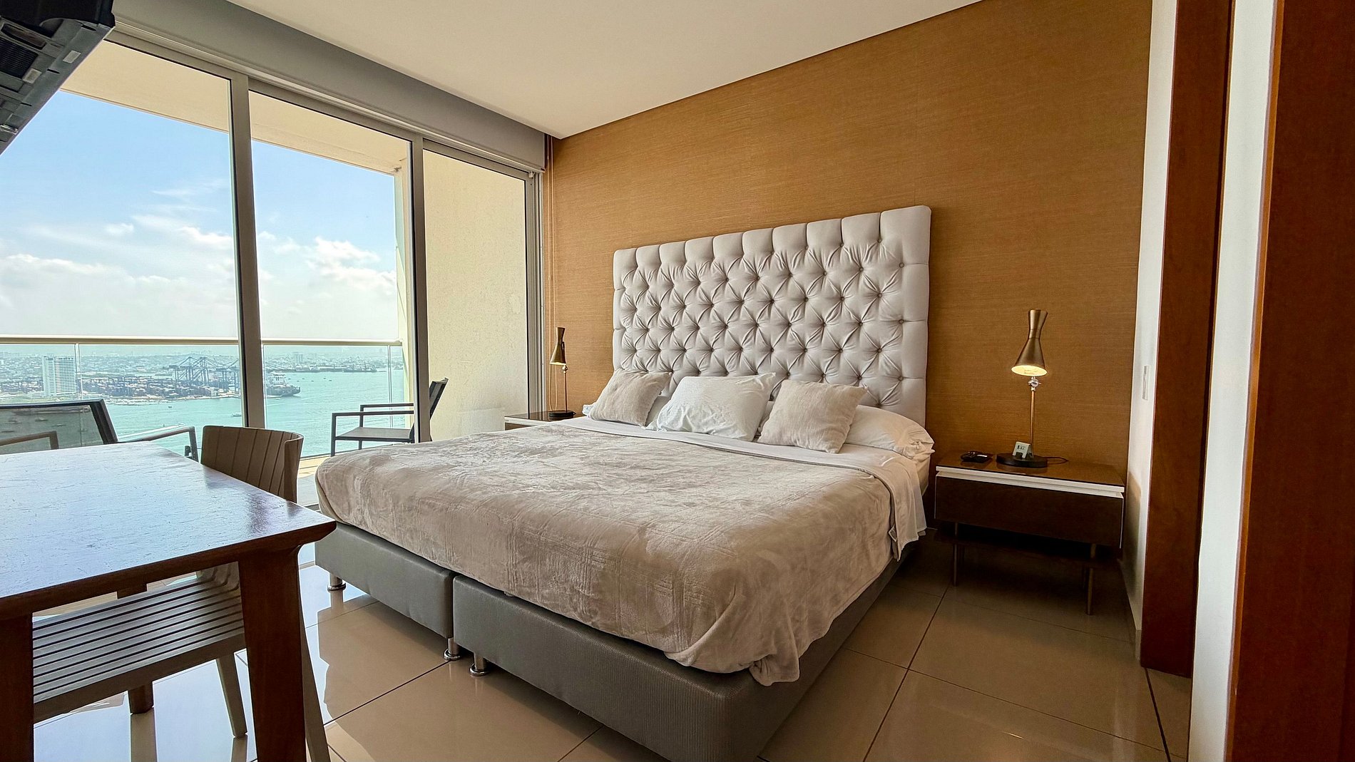 Habitación principal: Cama cómoda con ropa de cama premium Baño privado y amplio closet Smart TV y aire acondicionado central Acceso directo al balcón con vista a la bahía