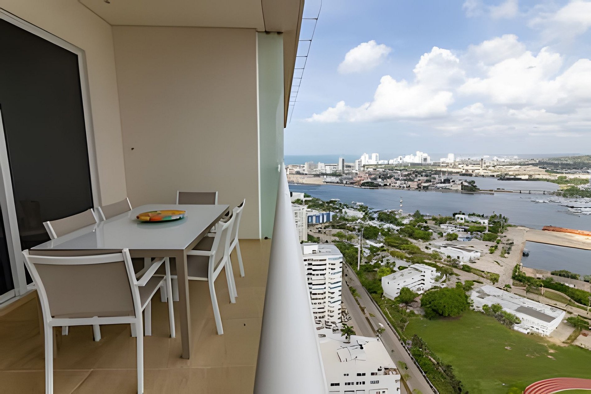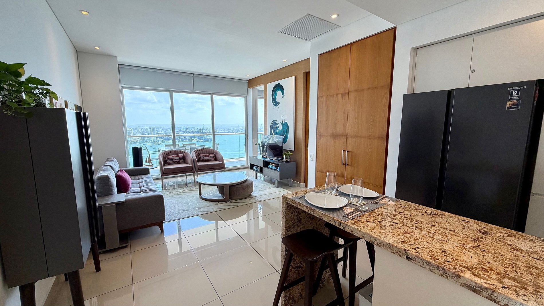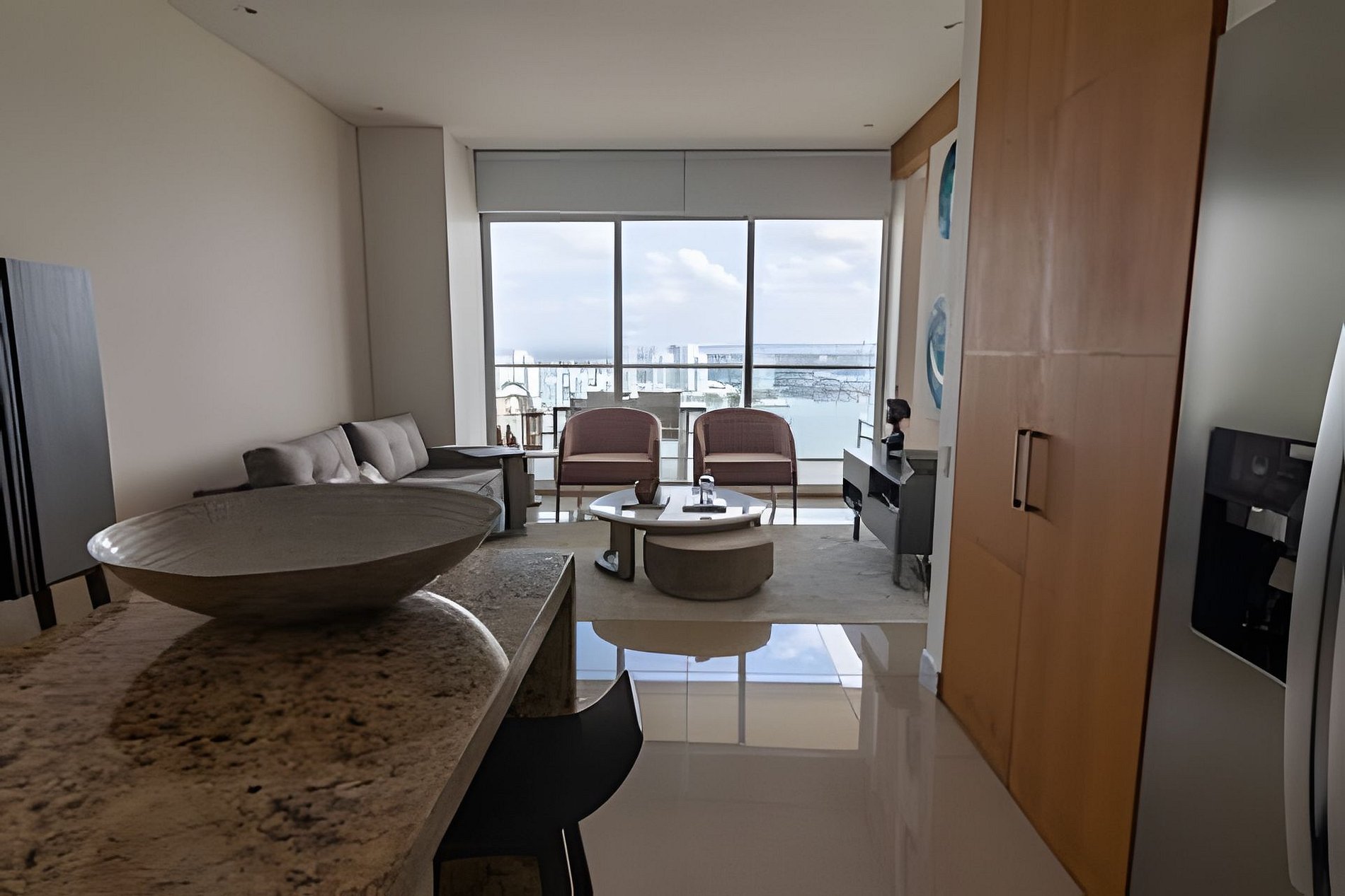 Apto de 1 hab en el piso 23 en uno de los edificios más prestigiosos de Cartagena ¡Con empleada como cortesía con servicio de limpieza y cocinando gratis durante su estadía! Tiene 1 cama king en el cuarto principal, baño adjunto y una amplia sala de estar con sofá cama. Cocina totalmente equipada con todo lo necesario. Gran balcón con mesa para cenar con una vista espectacular. La playa está cerca y la piscina tiene una vista al mar espectacular. ¡Centro comercial justo debajo del edificio!