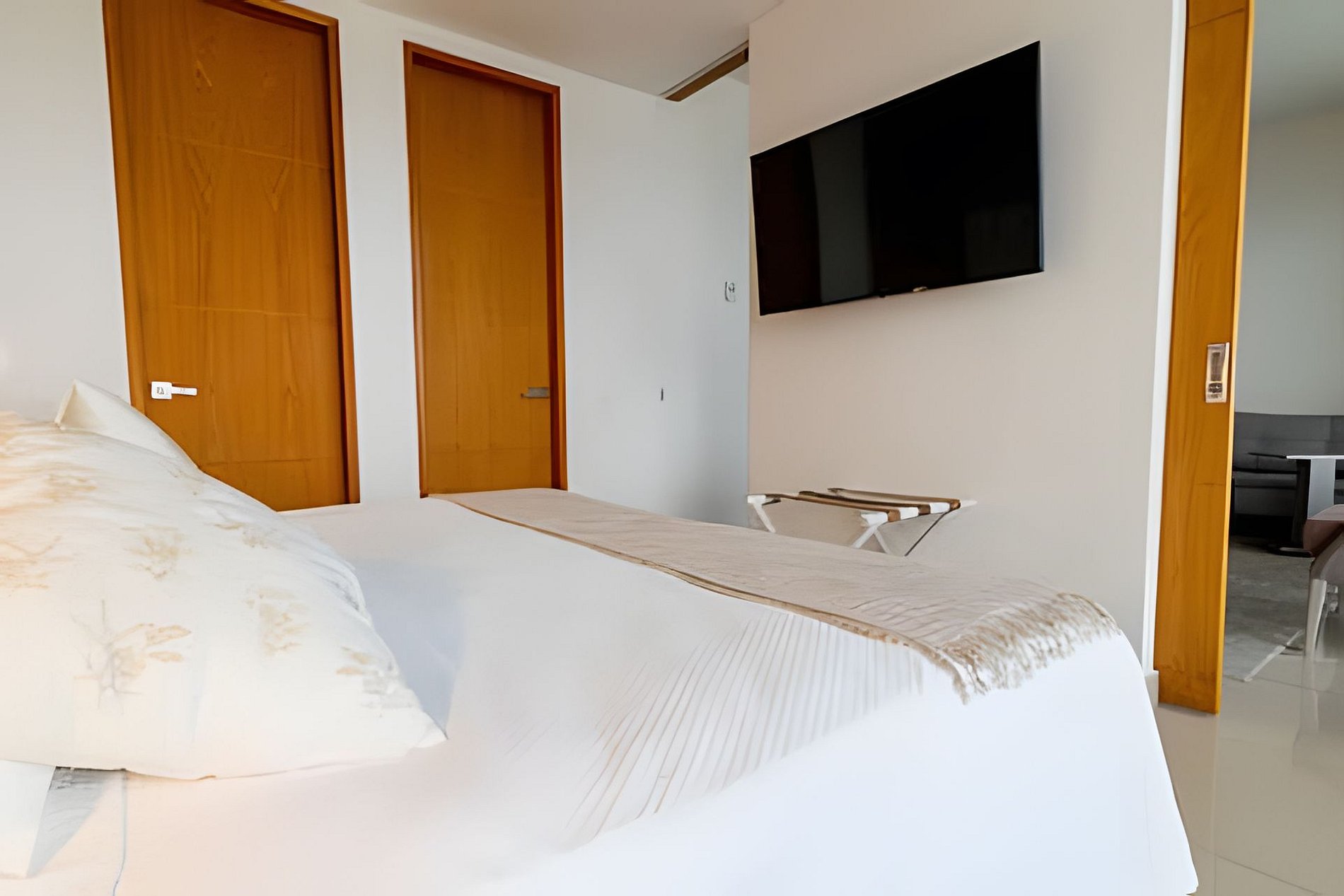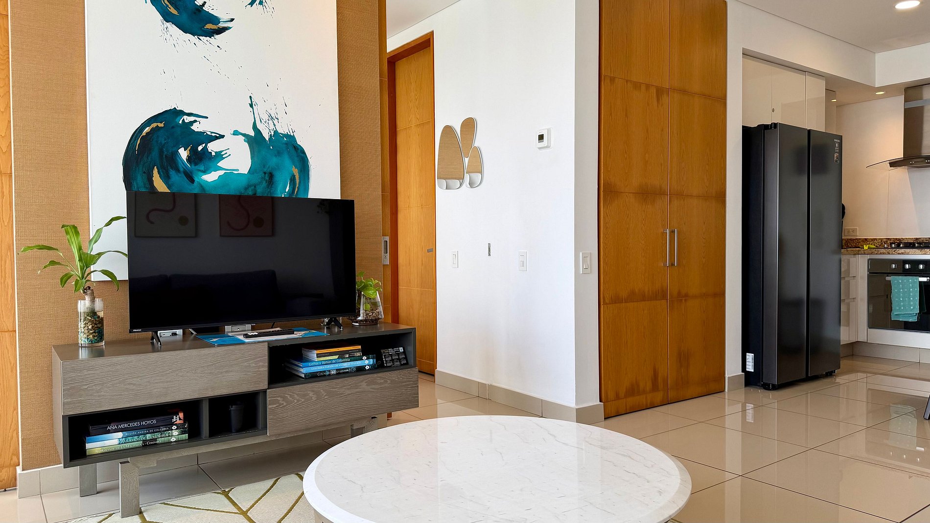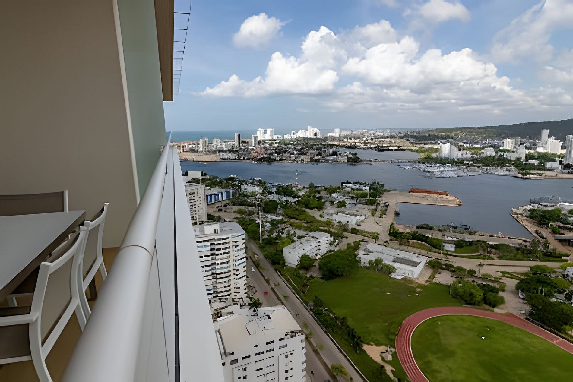 Apto de 1 hab en el piso 23 en uno de los edificios más prestigiosos de Cartagena ¡Con empleada como cortesía con servicio de limpieza y cocinando gratis durante su estadía! Tiene 1 cama king en el cuarto principal, baño adjunto y una amplia sala de estar con sofá cama. Cocina totalmente equipada con todo lo necesario. Gran balcón con mesa para cenar con una vista espectacular. La playa está cerca y la piscina tiene una vista al mar espectacular. ¡Centro comercial justo debajo del edificio!