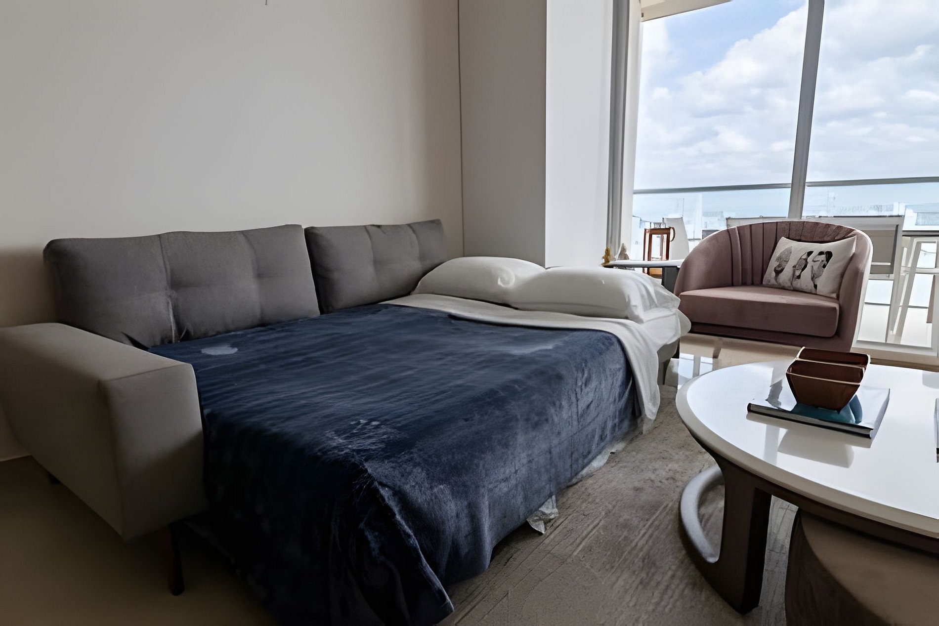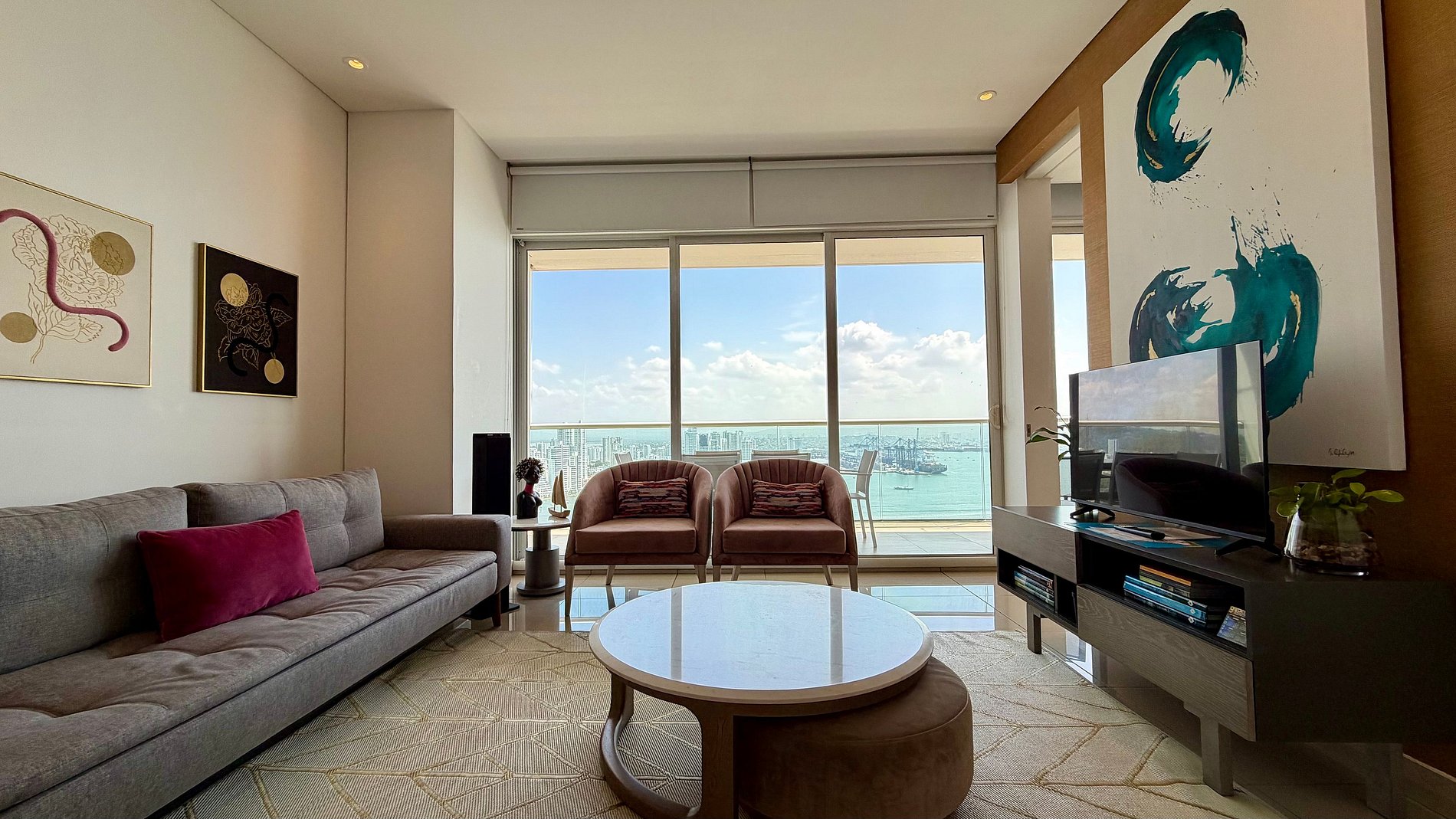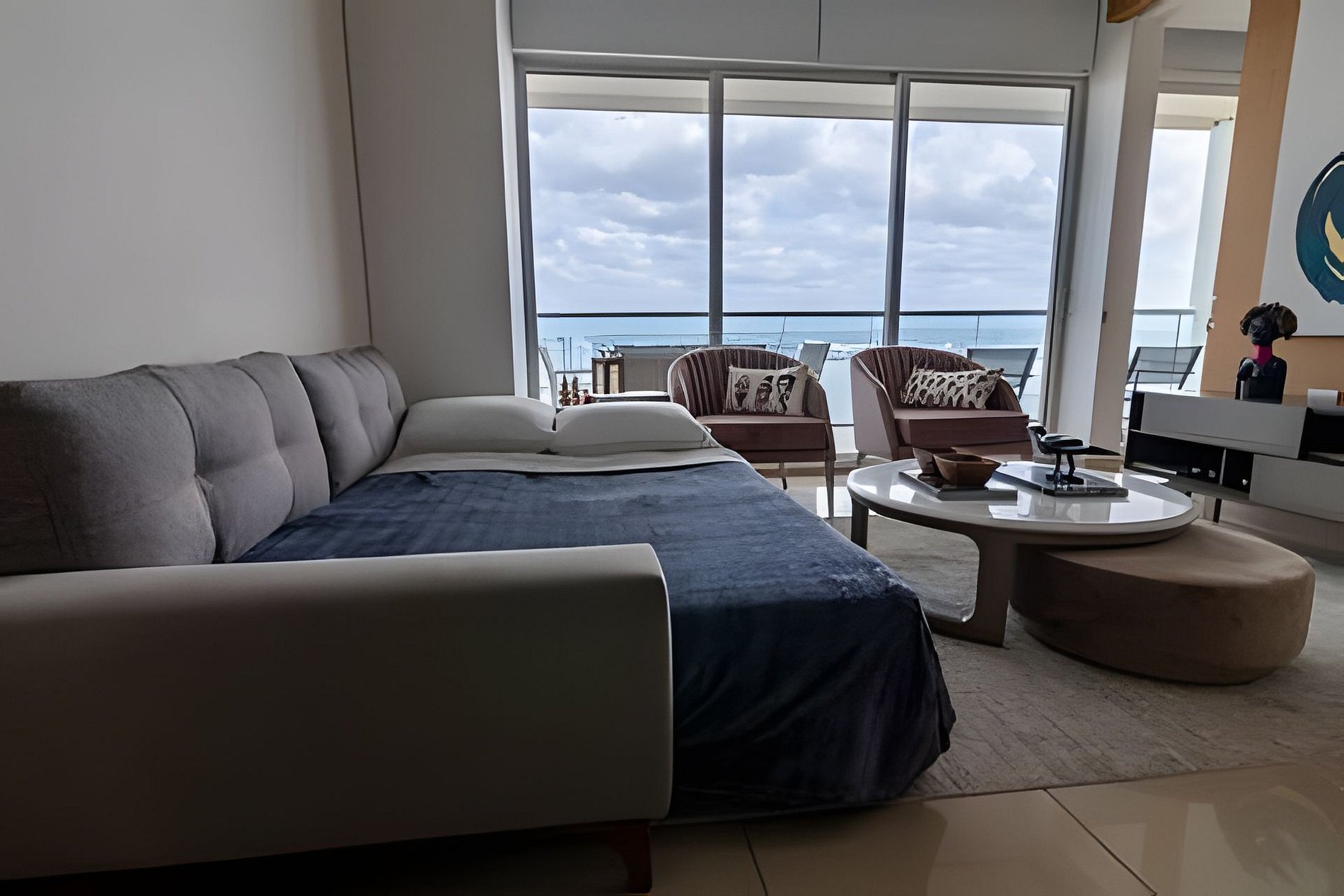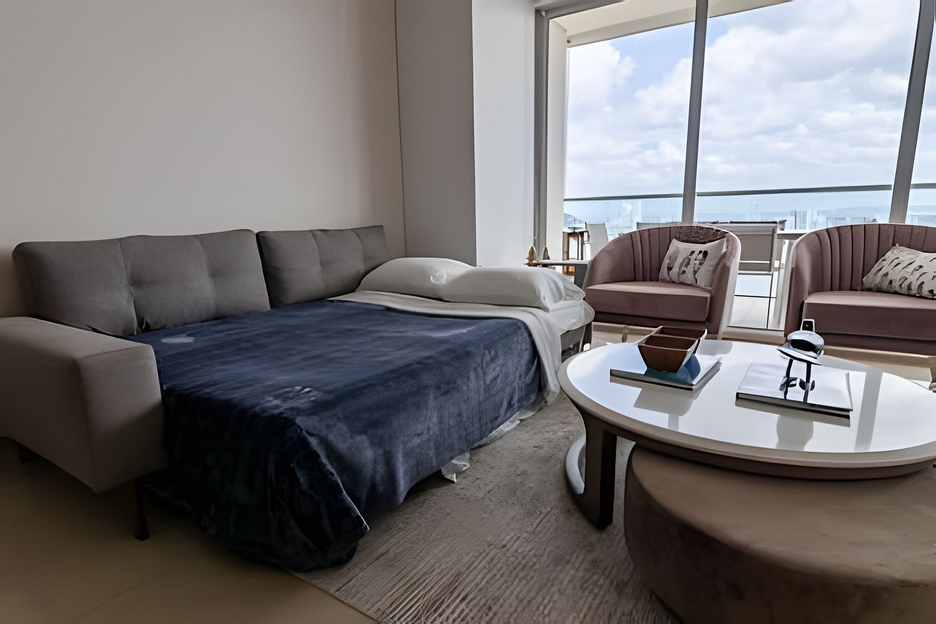Sala de estar: Sofá cama ideal para huéspedes adicionales Acceso al balcón con vistas impresionantes Decoración moderna y de alto nivel