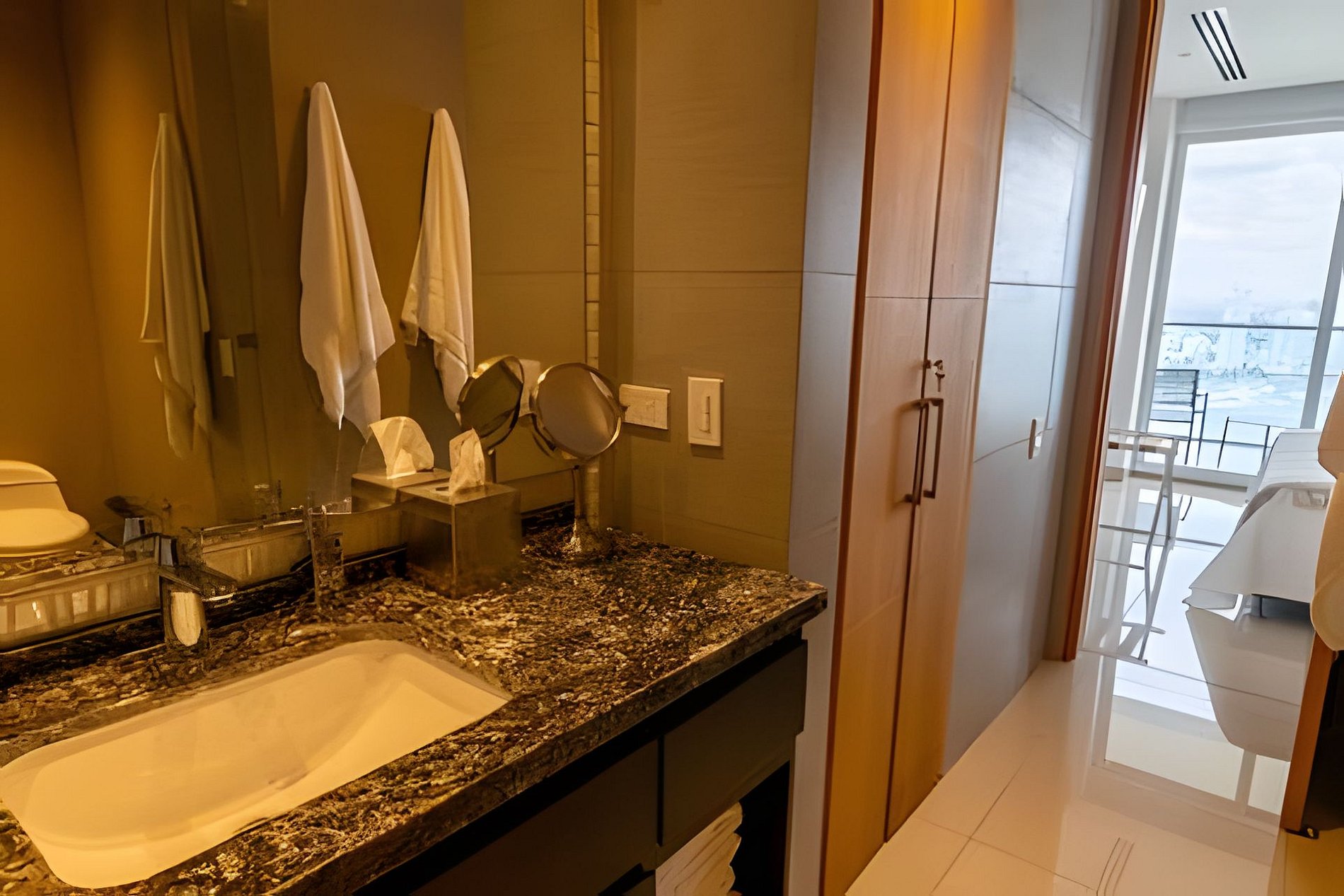 Habitación principal: Cama cómoda con ropa de cama premium Baño privado y amplio closet Smart TV y aire acondicionado central Acceso directo al balcón con vista a la bahía