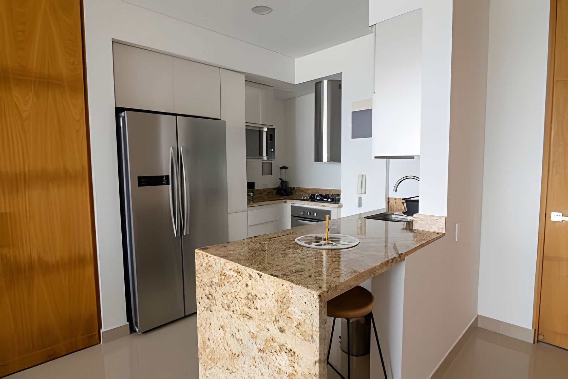 Este es un espacioso apartamento de un dormitorio que incluye una cama king en el dormitorio principal que se puede separar por dos sencillas y un sofá cama en la sala de estar. Un baño con acabados impecables y ducha de agua caliente. El apto cuenta con una cocina con todo lo necesario para su estadía. Este es un espacio que se adapta mejor a las parejas y familias pequeñas que desean el mejor lugar para pasar sus días en Cartagena. El apartamento tiene lavadora en caso de que necesiten utilizarlo. Tiene una espectacular vista al mar y el centro histórico que se encuentra a tan solo unos minutos del edificio. No se arrepentirán de quedarse en uno de las mejores ubicaciones que pueden seleccionar en Cartagena.